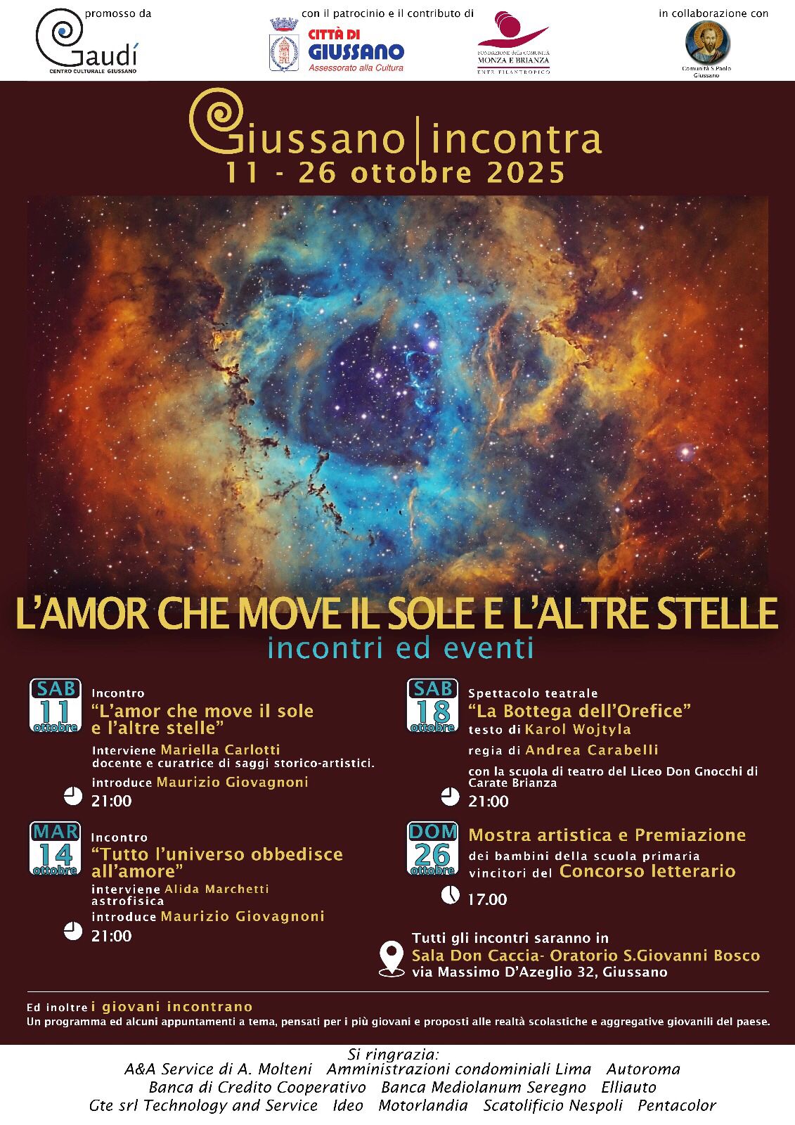 Carissimi amici e soci Vi invitiamo alla decima edizione di Giussanoincontrapromossa dal Centro Culturale Gaudì nel periodo della festa della Madonna del Rosario, dal tema“L’amor che move il sole e l’altre stelle”Eventi dall’11 al 18 ottobre in Sala don Caccia, oratorio di...