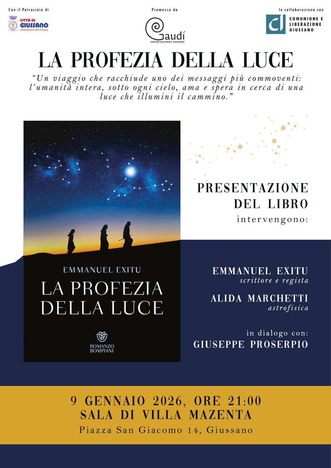 Iniziamo subito Venerdi 9 gennaio 2026 in Sala di Villa Mazenta incontrando lo scrittore e regista Emmanuel Exitu, che presenterà il suo nuovo romanzo “La profezia della luce”, ambientato in Terra Santa negli anni della nascita di Cristo.